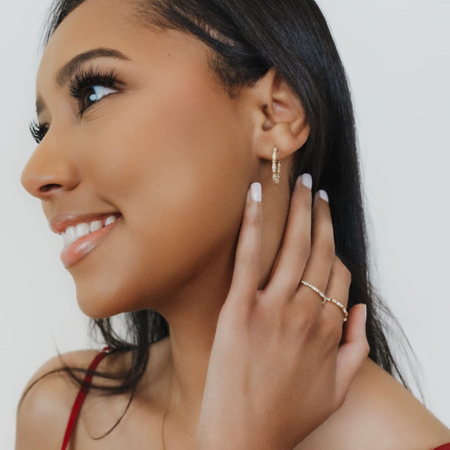 Per chi preferisce un’estetica pulita, essenziale e senza tempo, i modelli Punti Luce combinano linee fluide in oro 14 carati con diamanti singoli incastonati con precisione. Semplici e sofisticati, questi gioielli raccontano la forza silenziosa della sobrietà. Ogni diamante diventa un momento sussurrato—discreto, elegante e carico di significato.