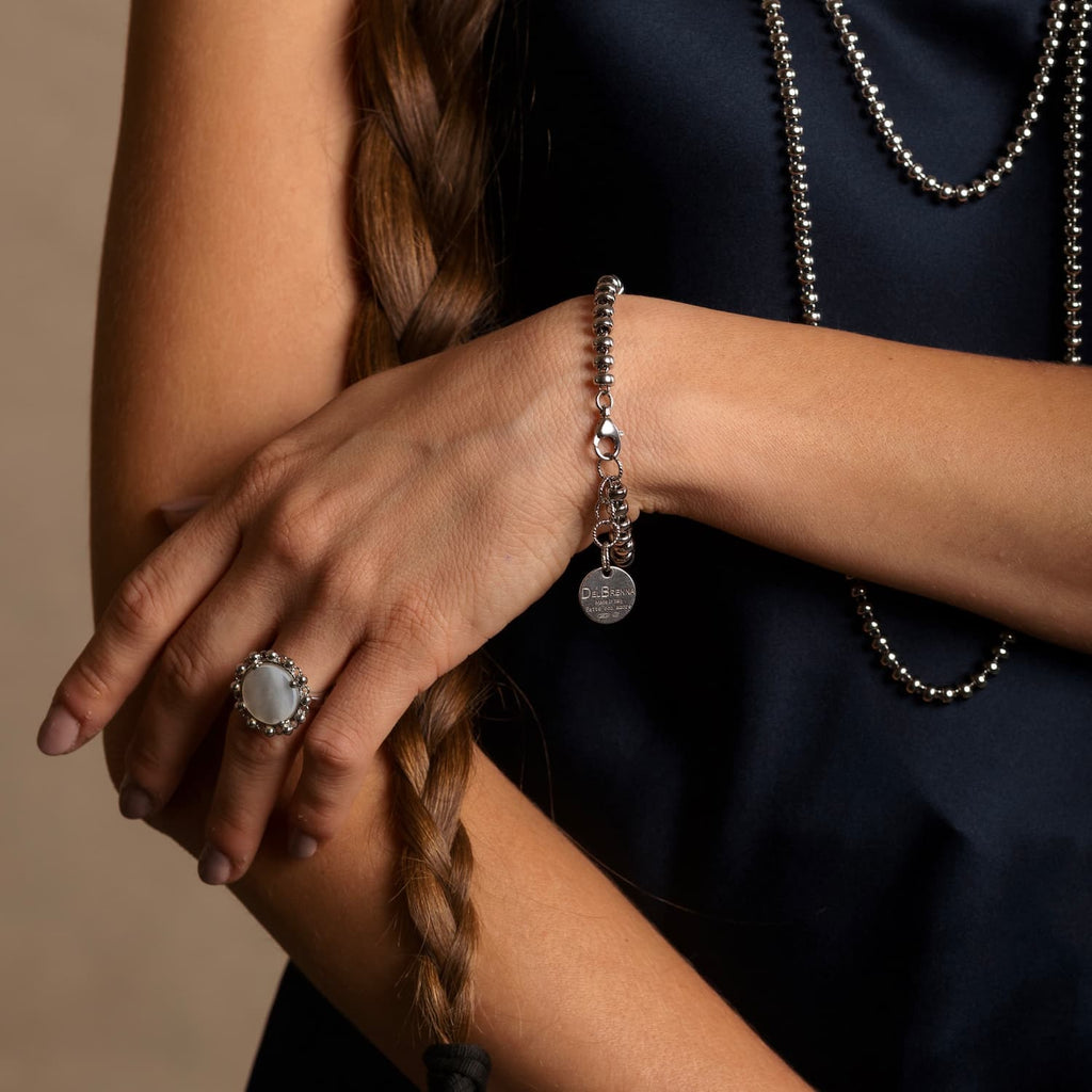 La collezione Ciambelle deve il suo nome alla forma rotonda e morbida dei suoi elementi, che ricordano il delizioso dolcetto. Questo bracciale è semplicemente unico, estremamente elegante indossato da solo, ma anche perfetto da abbinare ad altri design DelBrenna! I più affezionati riconosceranno a colpo d'occhio questo design, che non può mancare nella loro collezione personale DelBrenna!