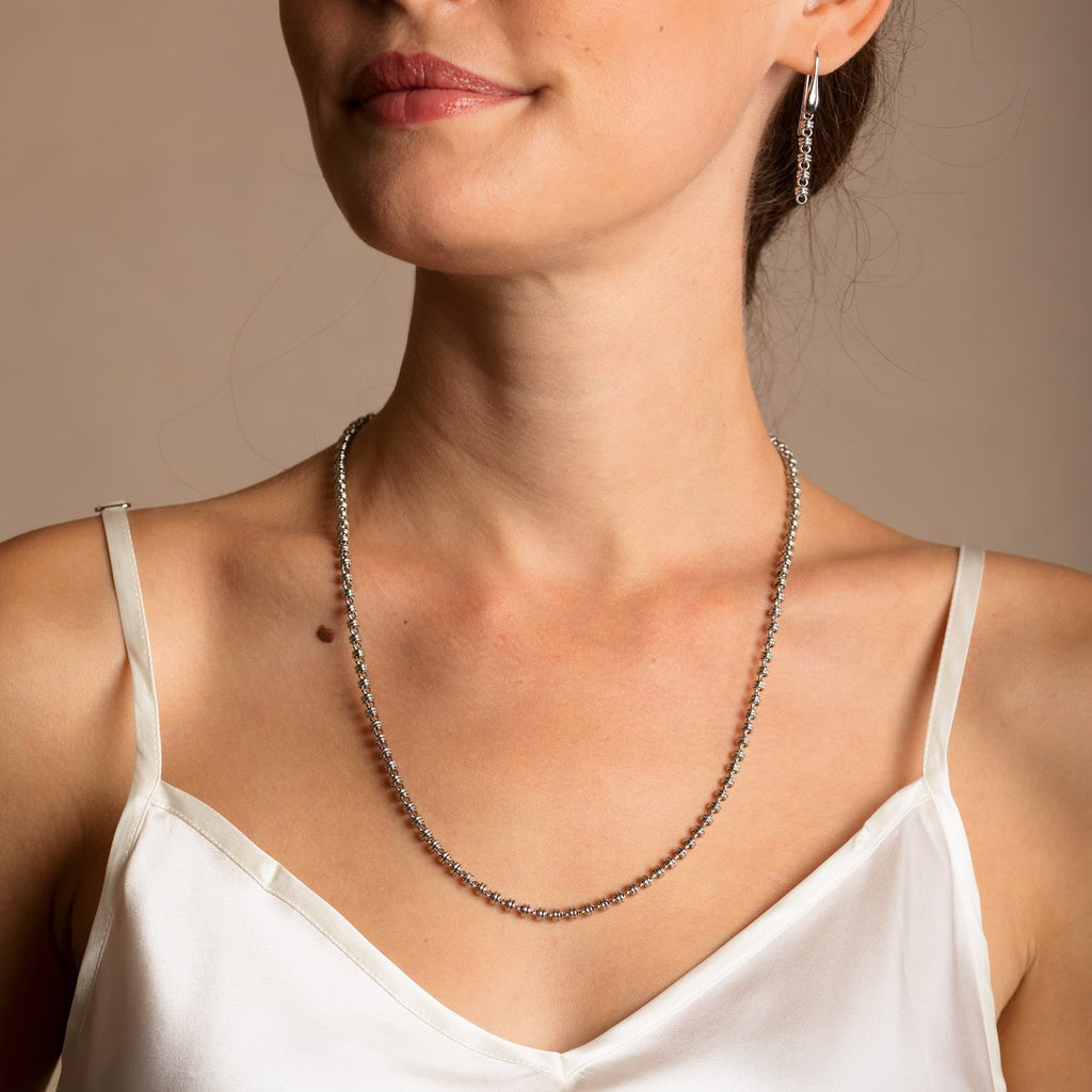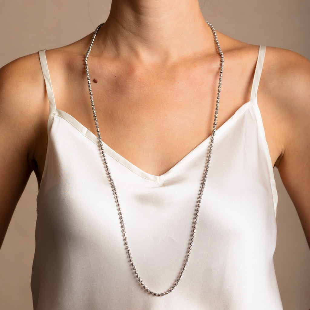- 86-91 cm, lunghezza collana "D" (86 cm di catena più 5 cm di estensione). Perfetta da indossare lunga o raddoppiata.