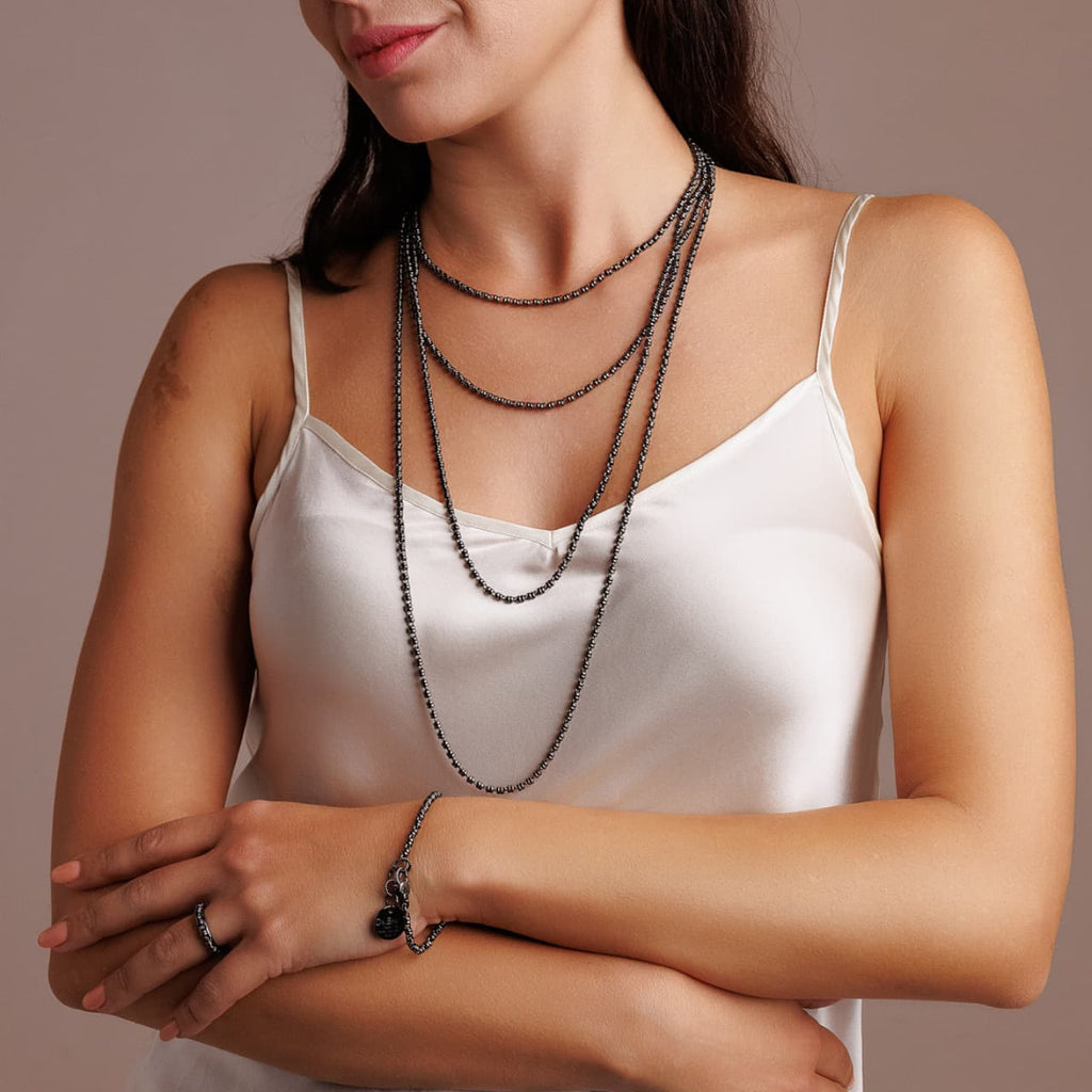 - 86-91 cm, lunghezza collana "D" (86 cm di catena più 5 cm di estensione). Perfetta da indossare lunga o raddoppiata.