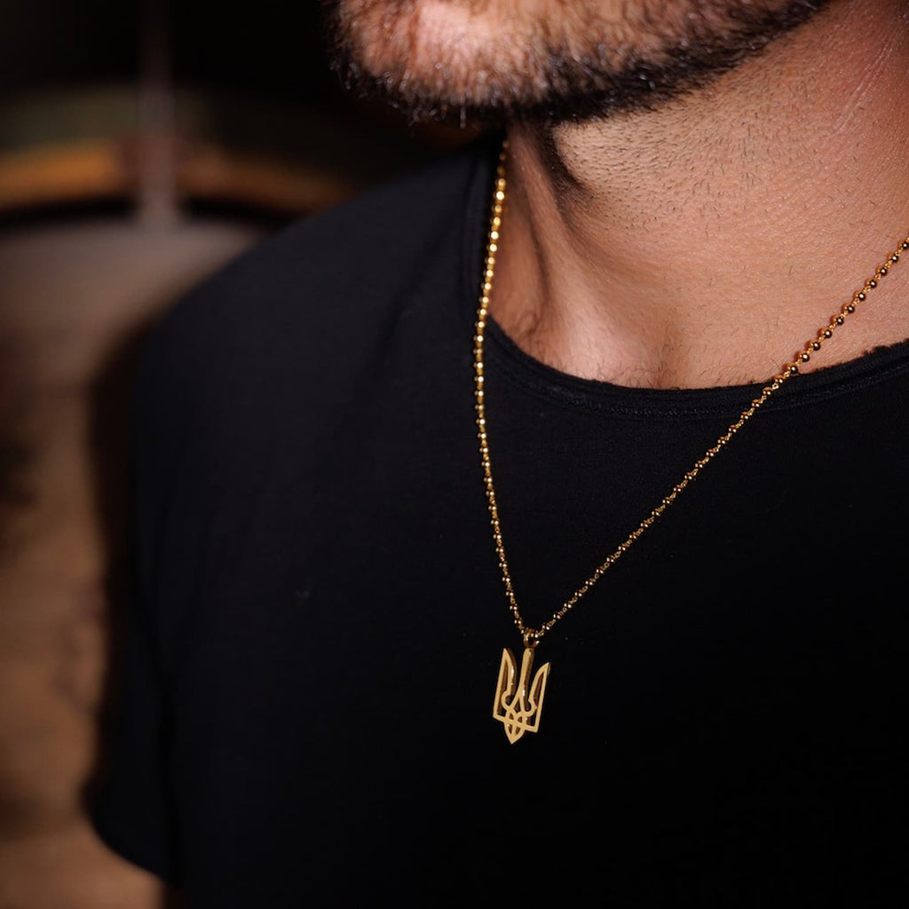 I piccoli elementi rotondi della nostra catena a Sfere creano un cerchio perfetto attorno al tridente, come un circolo infinito che alimenta la speranza di un domani più luminoso e un omaggio al coraggio e alla resilienza di coloro i quali vivono il conflitto in prima persona.