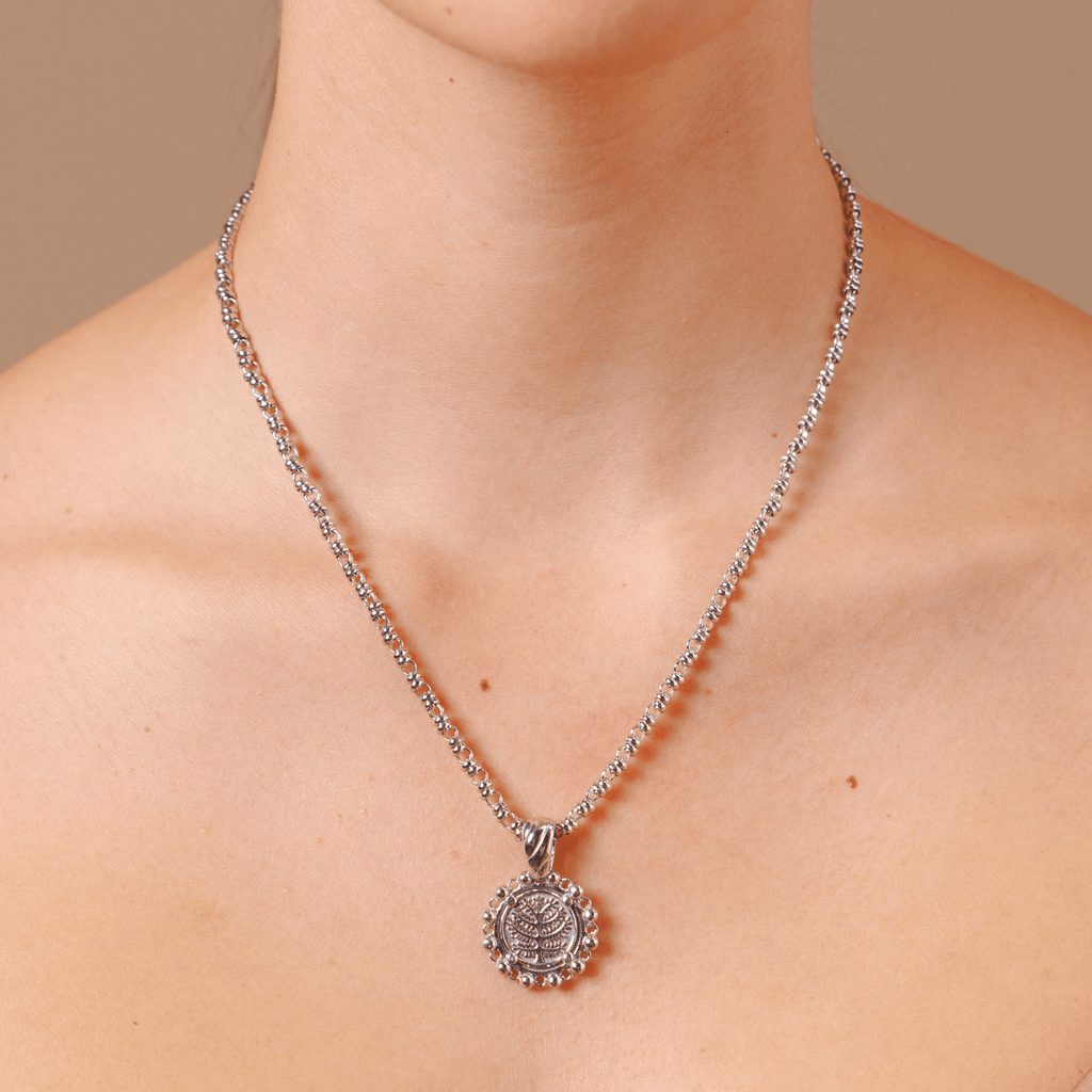 La cornice, realizzata interamente con la nostra catena originale Sfere, racchiude lo splendido medaglione con l'Albero della Vita, rendendo questo pendente un pezzo di grande impatto, che non passerà inosservato.
