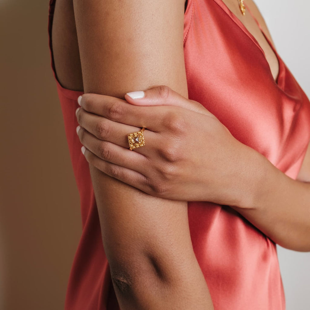 A incorniciare ogni pietra, la nostra inconfondibile catena Links, realizzata a mano e modellata come un abbraccio attorno alla gemma. Questo dettaglio unico valorizza la pietra e conferisce a ogni gioiello un’identità estetica tipicamente DelBrenna: ricca, architettonica e piena di carattere.